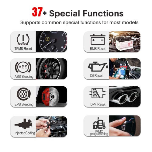 Supports common special functions for most models, such as maintenance light reset, throttle matching, steering angle reset, brake pad reset, tire pressure reset, ABS exhaust, battery matching, gear information learning, injector coding, DPF regeneration, IMMO, 37 special functions such as matching and IMMO programming.