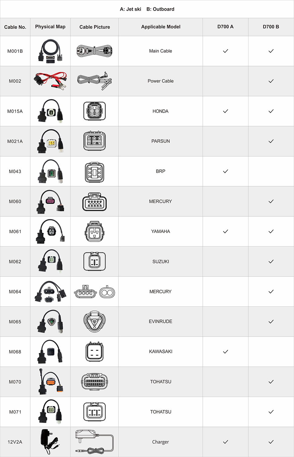 D700 B (Mainly for Outboard), supported brands as below: EVINRUDE, HIDEA, HONDA, JOHNSON, MARINER, MERCURY, PARSUN, SELVA, SEVEN, SUZUKI, TOHATSU, YAMAHA..