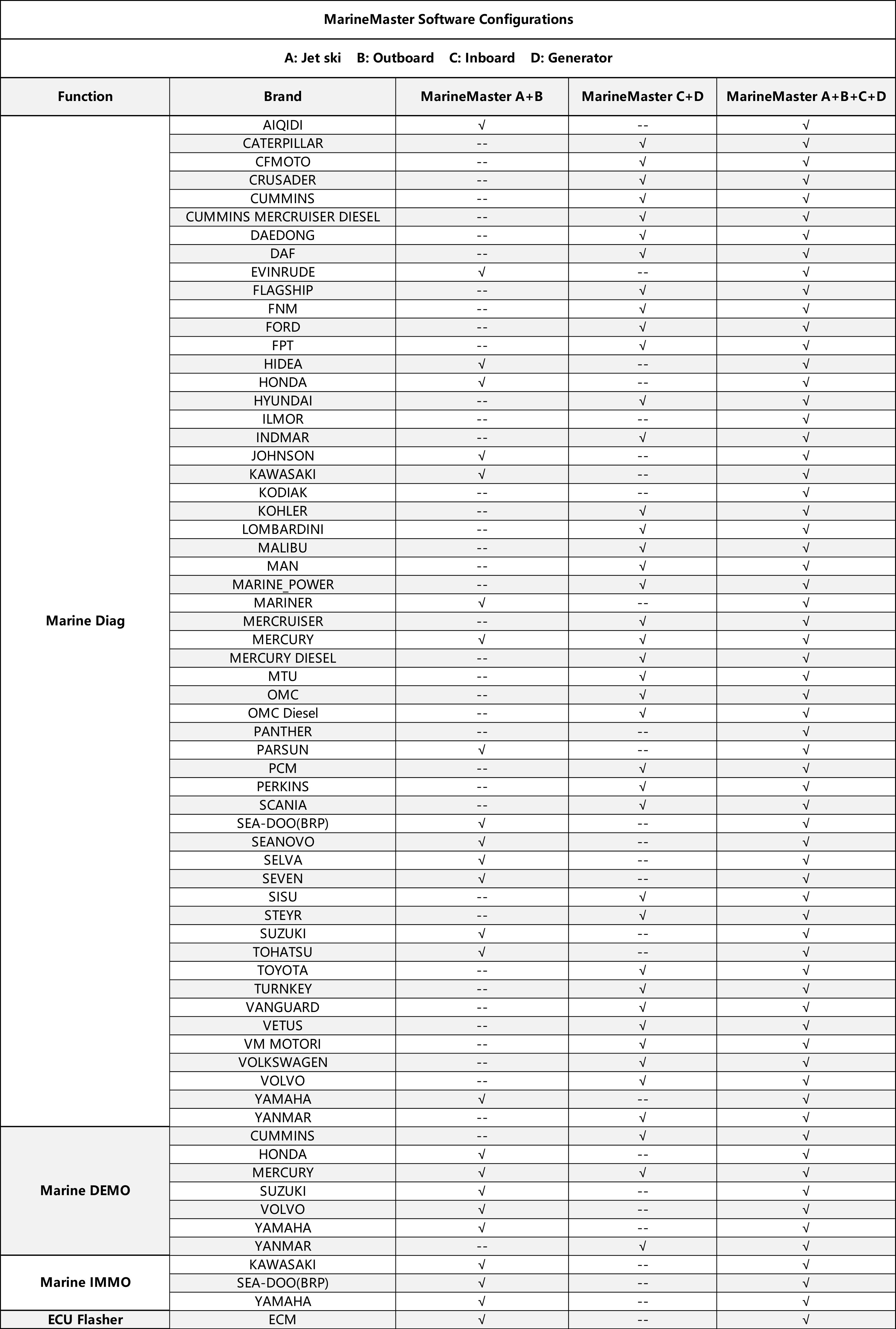 AIQIDI, CATERPILLAR, CFMOTO, CRUSADER ENGINES, CUMMINS MARINE, CUMMINS MERCRUISER DIESEL, DAEDONG, DAF MARINE, EVINRUDE, FLAGSHIP, FNM MARINE, FORD MARINE, FPT (Fiat Powertrain Technologies), HIDEA, HONDA, HYUNDAI SEASALL, ILMOR, INDMAR, JOHNSON, KAWASAKI, KODIAK MARINE, KOHLER, LOMBARDINI MARINE, MALIBU, MAN MARINE, MARINER, MARINE POWER, MERCRUISER, MERCURY, MERCURY DIESEL, MTU, PARSUN, PANTHER AIRBOATS, PCM Marine Engines, PERKINS, SCANIA MARINE, SEA-DOO(BRP), SEANOVO, SELVA MARINE, SEVEN MARINE, SISU, STEYR MOTORS, SUZUKI, TOHATSU, TOYOTA MARINE, TURNKEY, VM MOTORI, VOLKSWAGEN, VOLVO PENTA, YAMAHA, YANMAR...